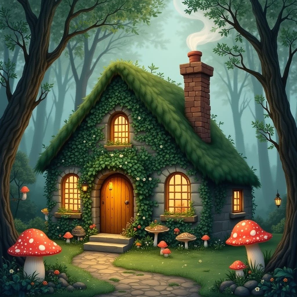 A storybook illustration of a cozy cottage in an enchanted forest. Soft pastel colors and delicate lines depict ivy-covered walls, a moss-thatched roof, and bioluminescent mushrooms.