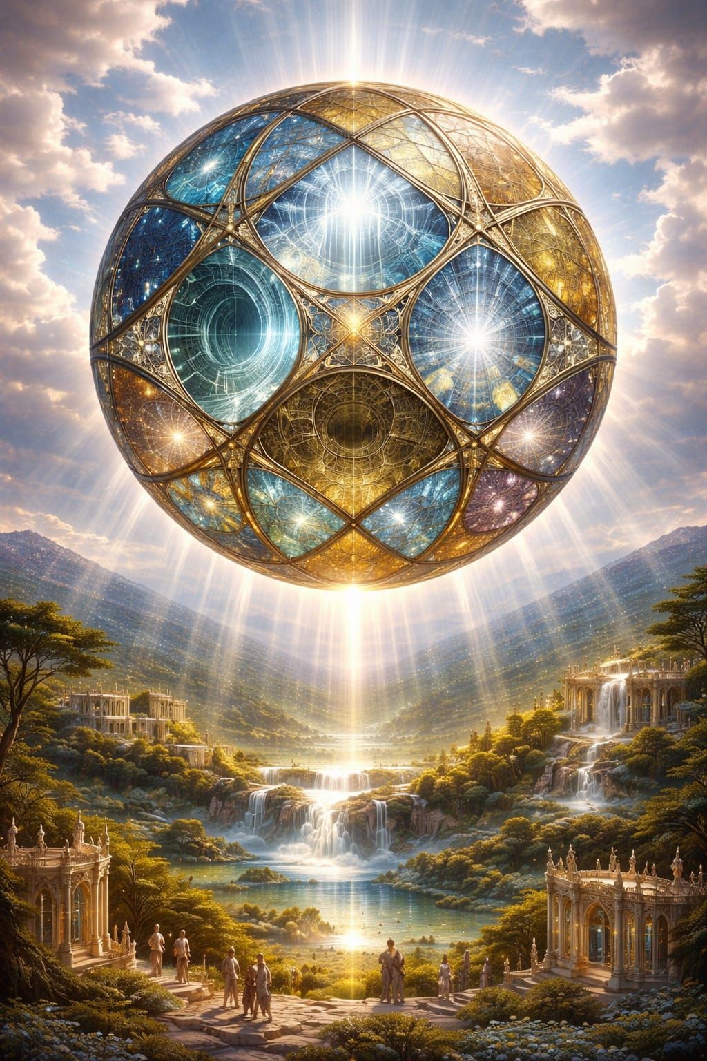 use images 1-5 as if they were pieces of patchwork fabric, cut pieces from each to fill the shapes in the sphere in image 6 to form an intricate and pleasing pattern, maintain the look of the sphere being lit from within, but ignore reflections, and maintain the background keeping figures unchanged. ...