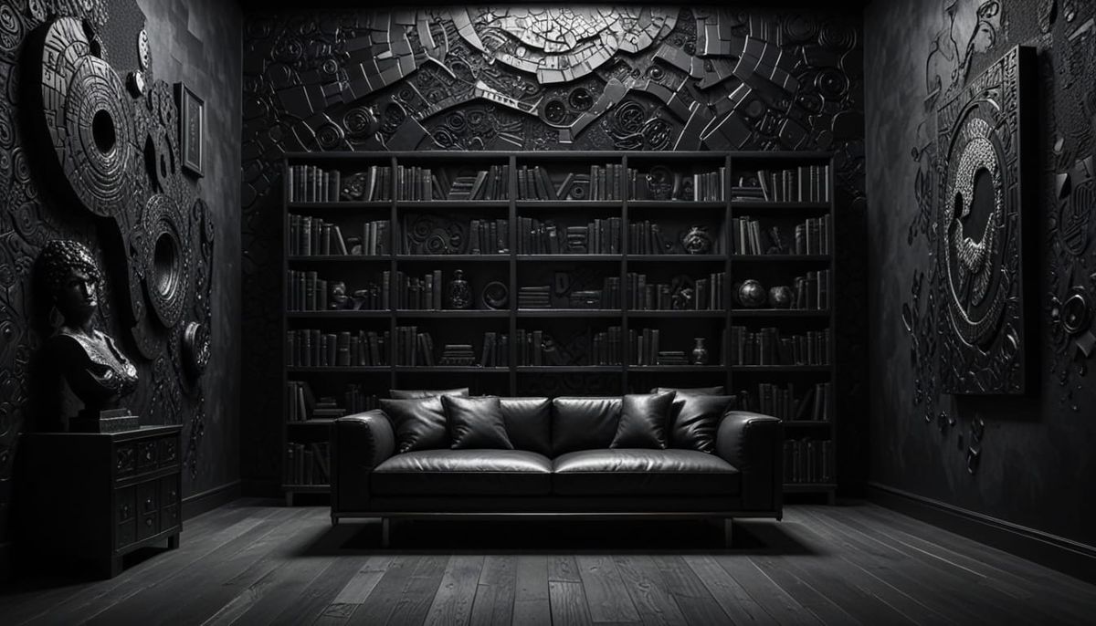 This image features a severe, polished black wood bookcase filled with ancient black tomes. It showcases dramatic lighting, deep shadows, and mosaic elements, presented as a modernist, minimalist oil painting.