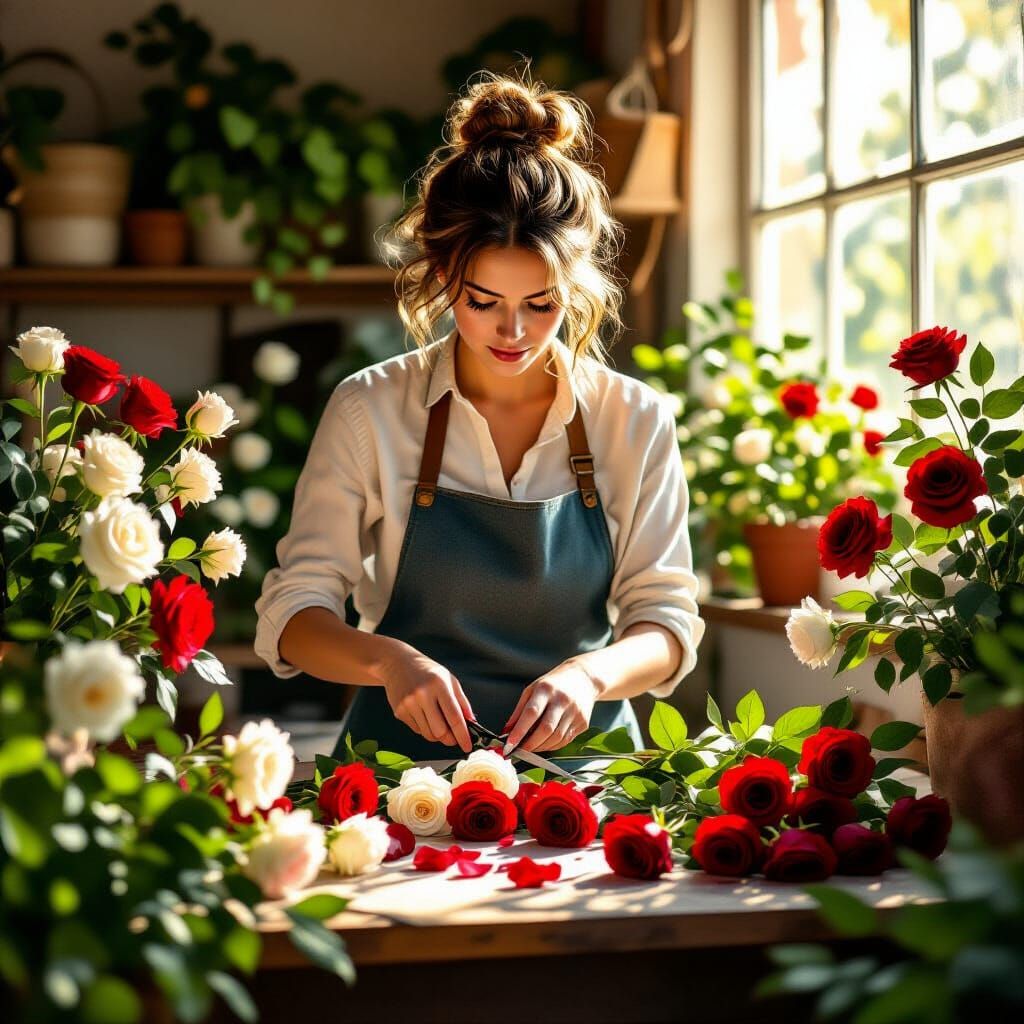 This image shows a florist in his workshop, bathed in warm sunlight, expertly cutting red and white roses amidst lush greenery. The artwork has a surreal color palette with loose, expressive brushstrokes.