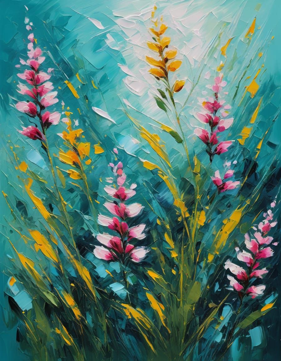 This oil painting captures a vibrant field of wildflowers with thick impasto brushstrokes. Pink and yellow blossoms are sculpted with visible palette knife textures against a teal and blue background, creating a lively yet serene mood.
