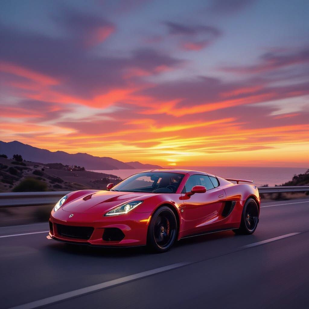 A hyperrealistic image of a red sports car driving on a coastal highway during a vibrant sunset. The scene features dramatic lighting and cinematic quality, reminiscent of professional automotive photography.