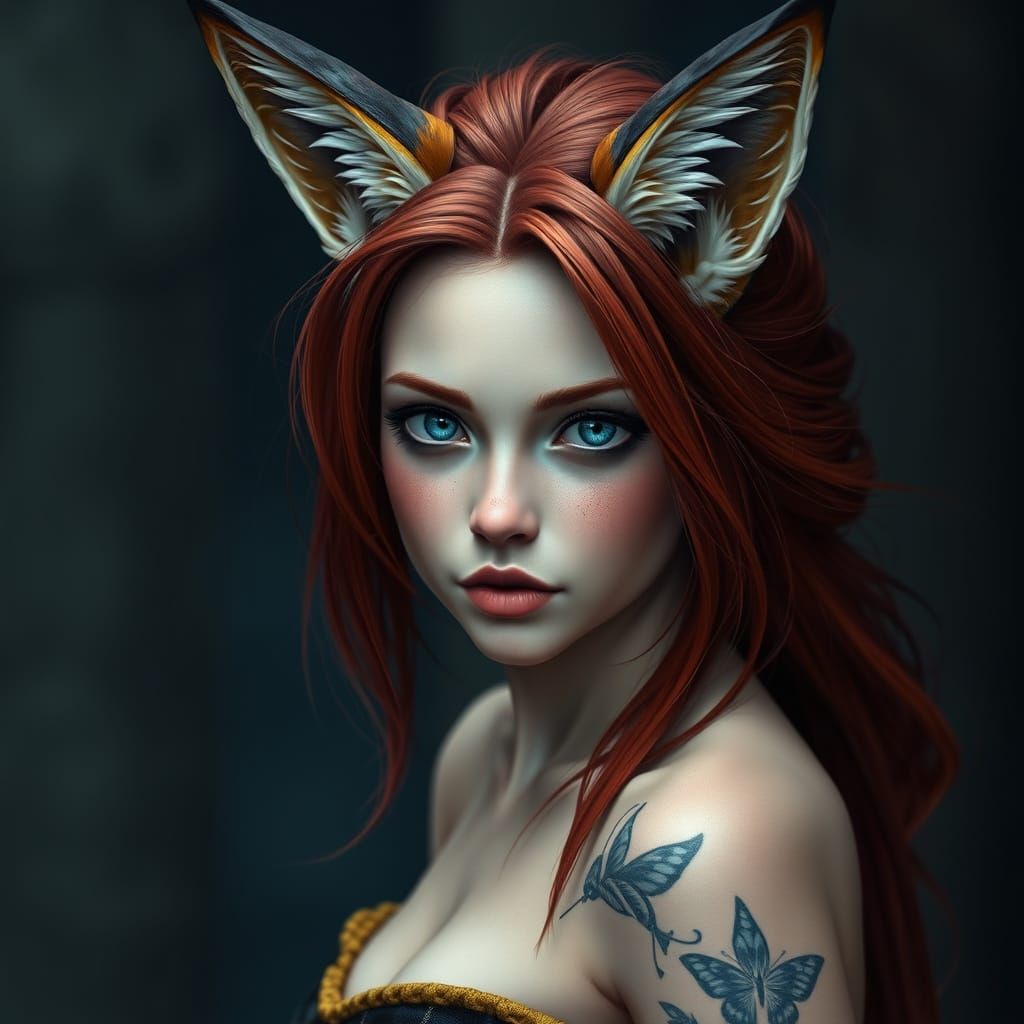 A captivating image of a foxgirl with a beautiful face, vibrant red hair, and striking blue-grey eyes. She wears a short tartan skirt and boasts intricate butterfly and hummingbird tattoos, set against a rich, deep-colored background.
