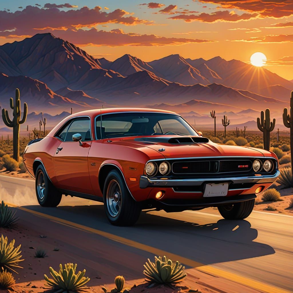 This vibrant oil painting captures a lineup of iconic American muscle cars and a modern Dodge Challenger racing across a dynamic desert landscape at sunset. Gleaming chrome details and exotic silhouettes are highlighted by golden hour lighting.