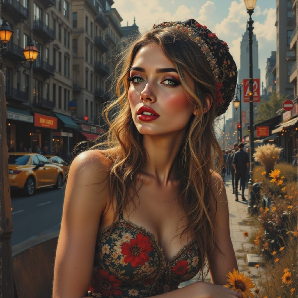 A striking portrait of a woman in an urban setting. This image showcases a golden hour aesthetic and comic book style, depicting everyday life with bold lines and vibrant colors.