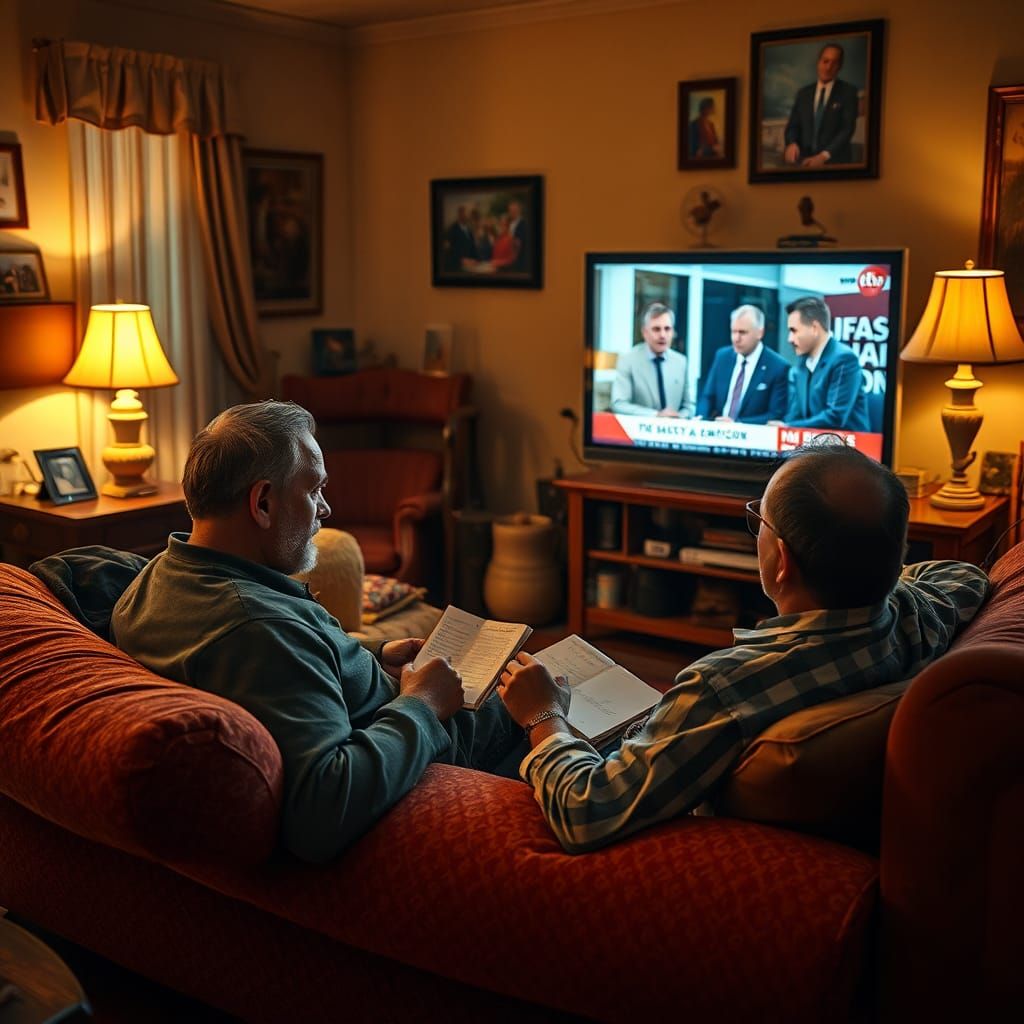 A hyperrealistic image shows a man on a velvet couch, writing a poem in a warmly lit room. A television displays news commentators in the background, rendered with cinematic depth and vibrant colors.