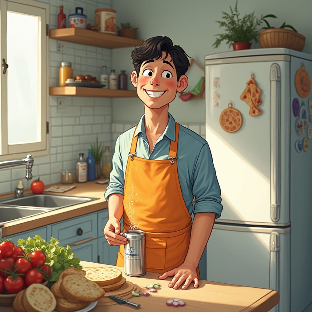 This image shows a colorful, eclectic kitchen scene with a clever Israeli person proudly using a modified SodaStream machine, surrounded by humorous details and natural lighting, in a style reminiscent of whimsical, pop art aesthetics.