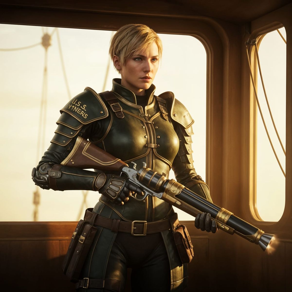 This image depicts Brenna, a woman with short blond hair and a sharp gaze, wearing detailed dark green and brass leather armor. She stands on an airship, holding a steam-powered musket.