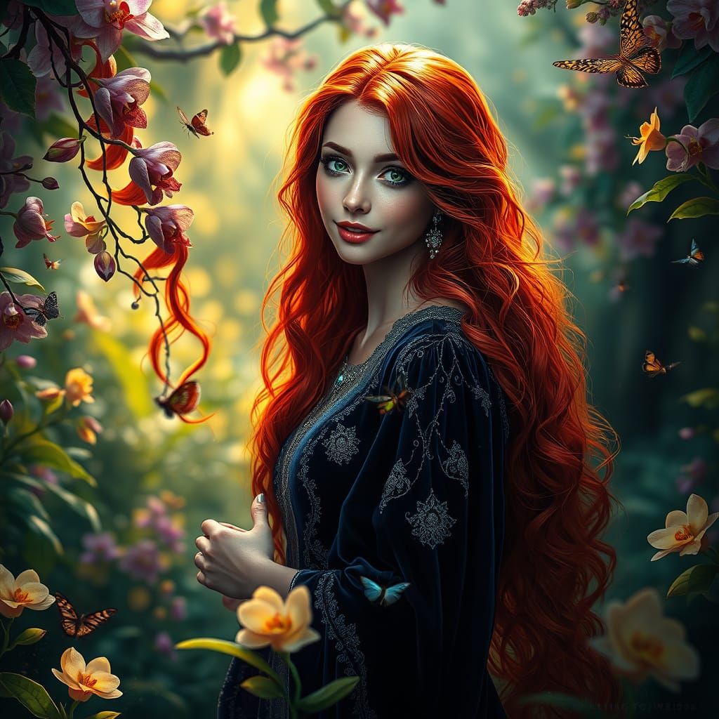 This enchanting image depicts a serene woman with vibrant red hair, posing in a mystical garden filled with exotic greenery and rare flowers. Delicate insects flutter around her, and soft, ethereal light illuminates her porcelain-like complexion, creating a dreamlike ambiance.