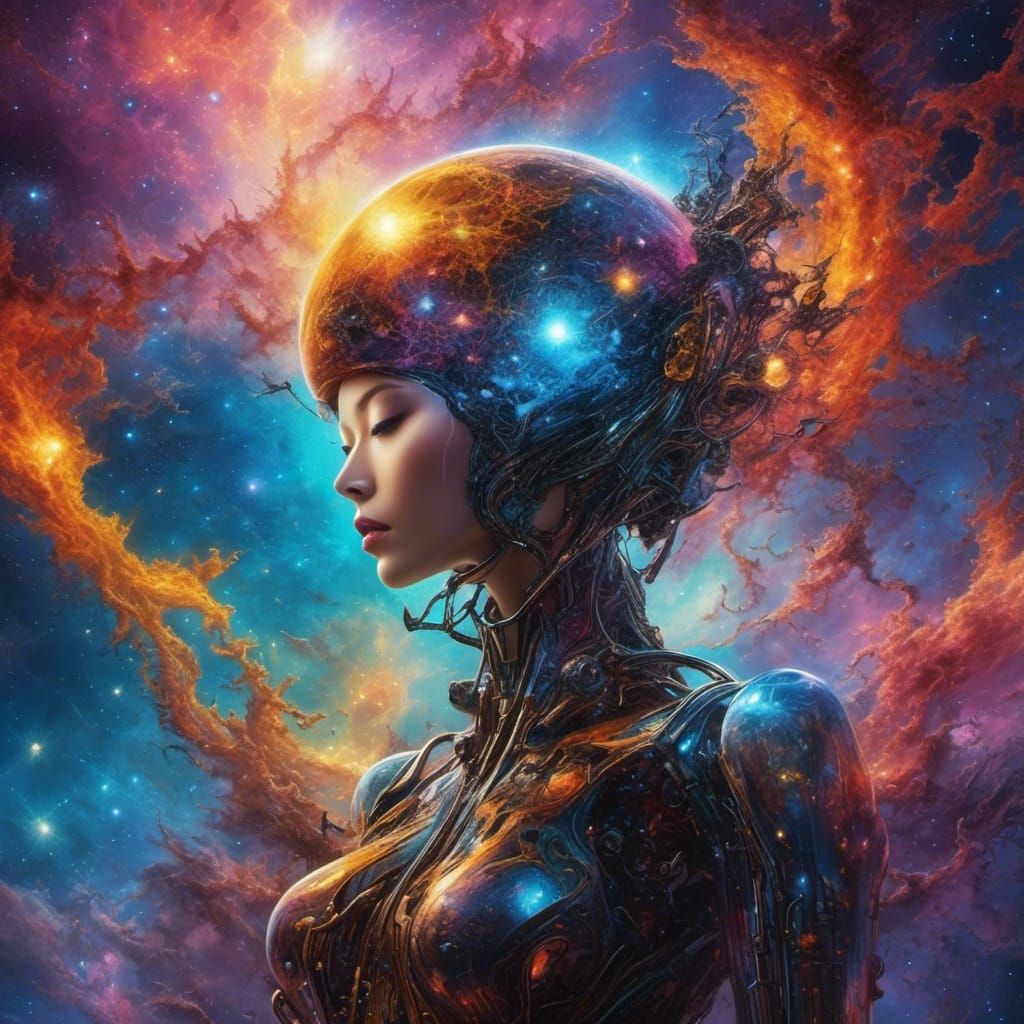 A digital rendering of a futuristic android in a cosmic setting. The artwork features vibrant colors and intricate details, reminiscent of advanced technological design. The android has Asian features.