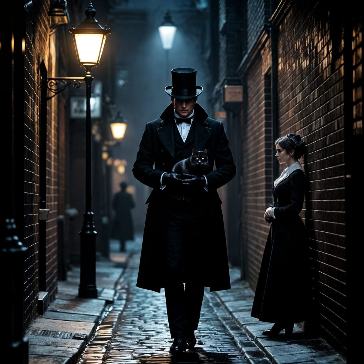 This image shows a tall man in a dark coat and top hat walking through Victorian London at midnight, holding a black cat. The scene features dramatic lighting reminiscent of gothic art.