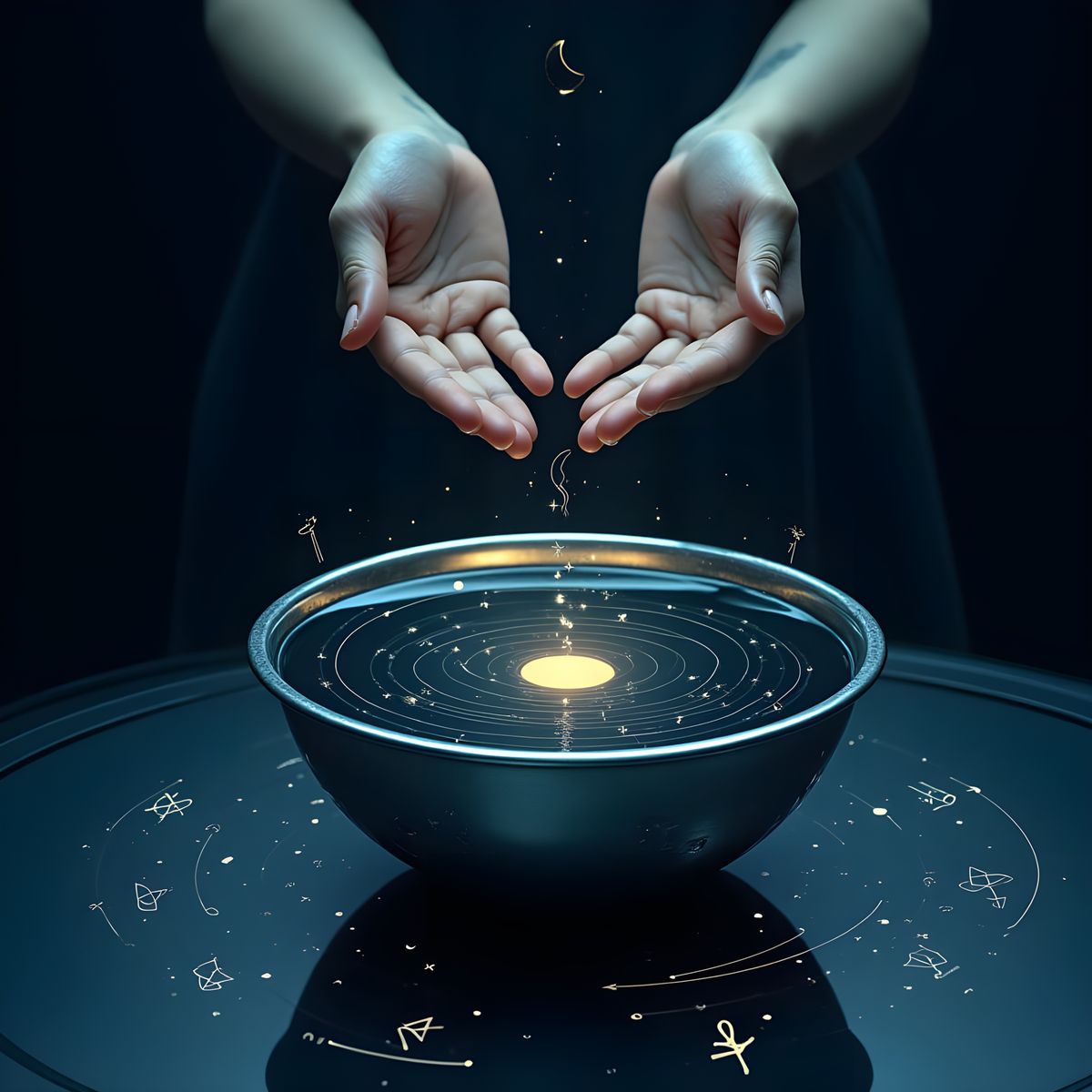 This image shows a mystical silver bowl filled with dark water, reflecting constellations and a glowing eye. The scene is set with ethereal lighting, dark blue and silver tones, and hyper-realistic details. The artwork is created in a realistic style, with a focus on mystical and symbolic elements.