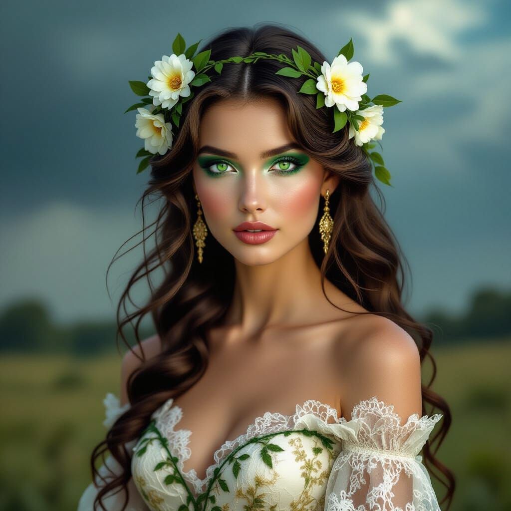 Beautiful woman with alabaster skin, piercing emerald eyes, and emerald makeup, wearing elegant gold lace, a flower headpiece, and green vines in my hair as Scarlet be beside her against the weather, Texas background, and a dream like fantasy, romanticism style, reminiscent of Kinuko Craft, Jasmine, ...