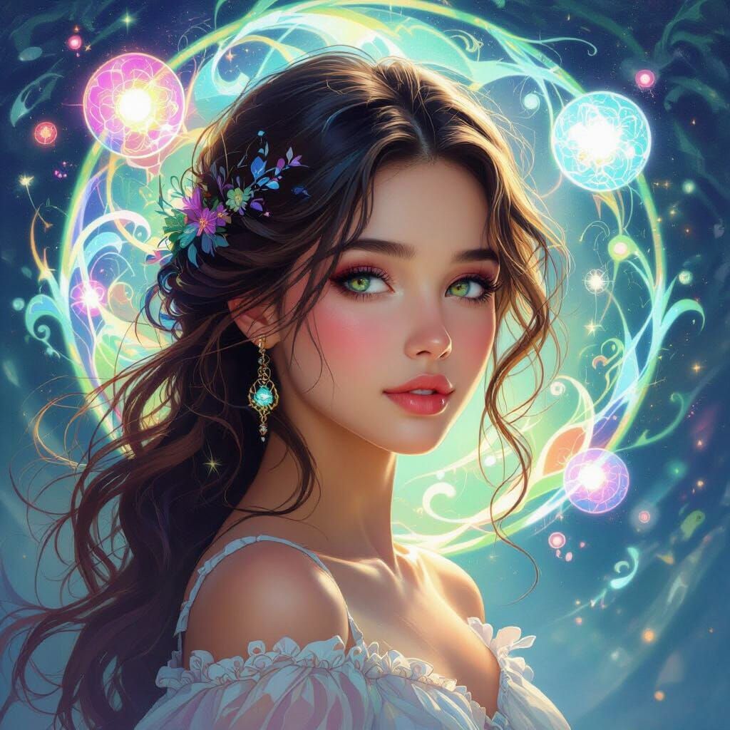 This digital portrait captures a beautiful young woman against a vibrant, swirling background filled with mystical glowing orbs. The ethereal, dreamlike style features intricate details and a luminous glow.