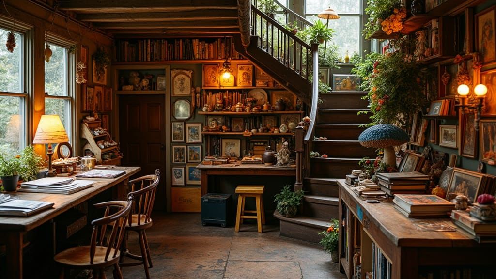 This image shows a charming antique shop with worn wooden stairs, vibrant toadstools, vintage books, and vinyl records, all bathed in warm, golden lighting reminiscent of traditional folk art