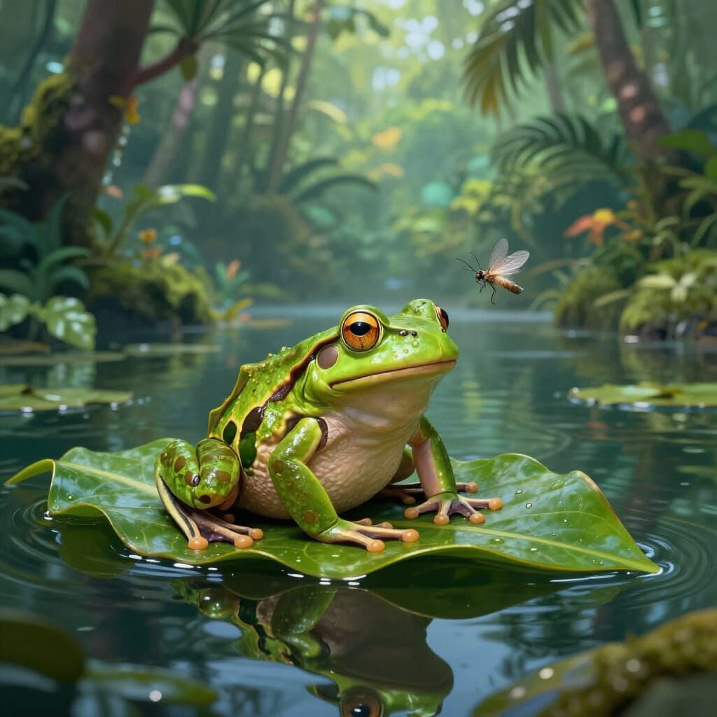 This image shows a plump frog catching a fly while resting on a leaf in a tropical lake. Rendered in a detailed matte painting style with cinematic lighting.