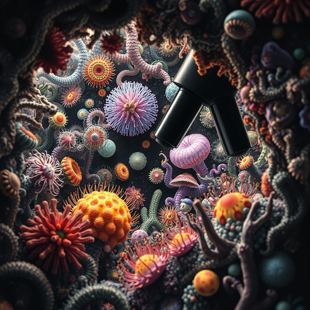 A surreal image shows a black and white portrait observing a microscopic world. Bizarre, vibrant organisms fill the scene in a psychedelic and otherworldly biological illustration style.