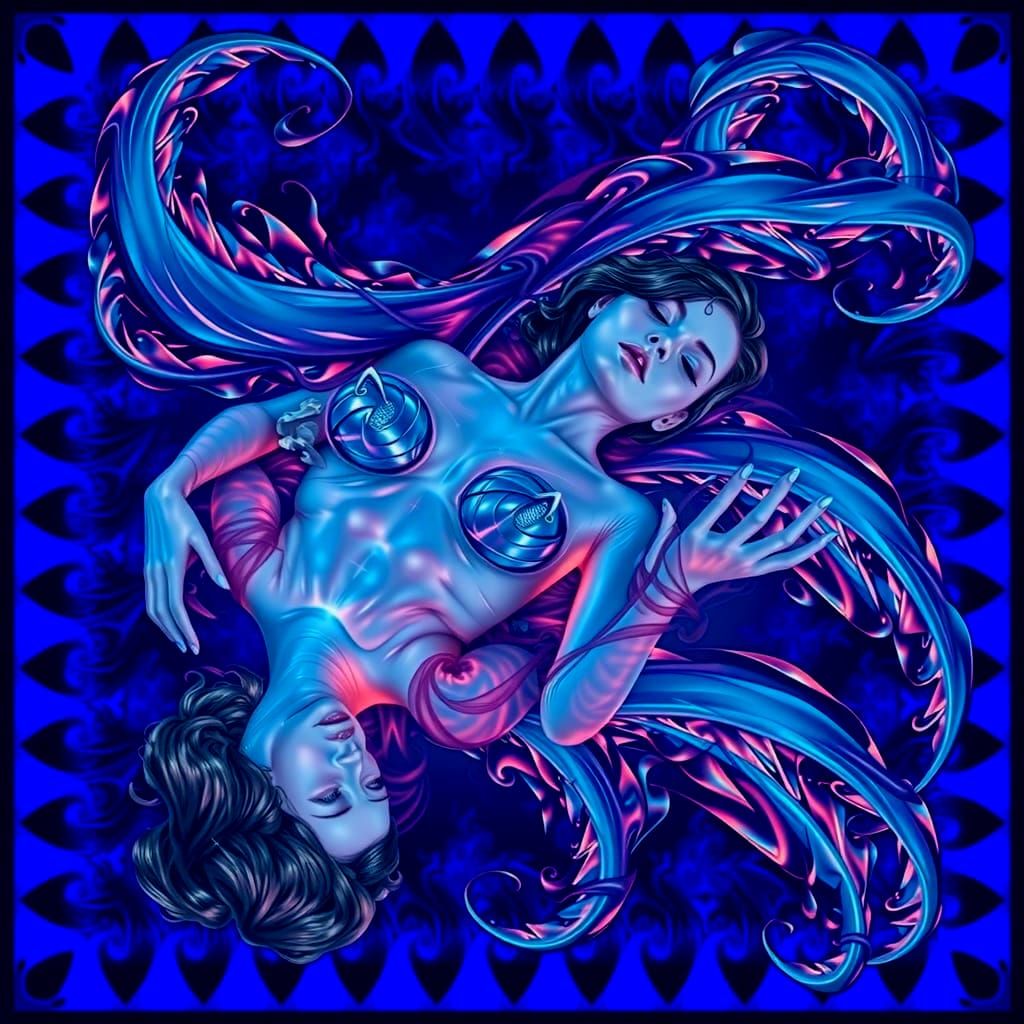 This image shows a woman with translucent skin texture floating in blue, purple, and silver mists. Dramatic lighting highlights her form, with vibrant streaks of color creating an otherworldly, cinematic atmosphere.