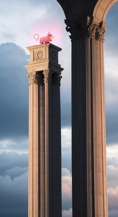 This image depicts a pink kitten guided by divine pillars of cloud and fire. The surreal scene blends religious symbolism with a whimsical, pastel aesthetic.