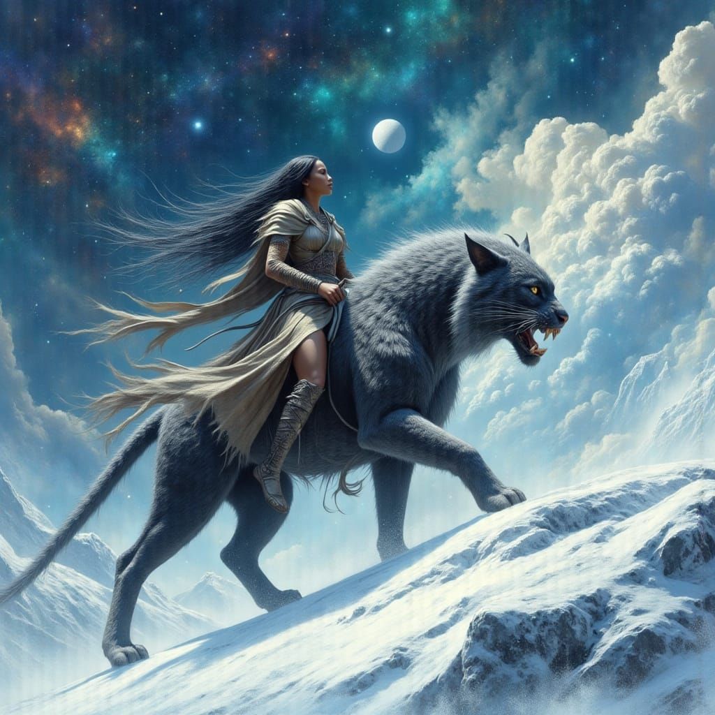 A stunning image of an African warrior queen riding a saber-toothed cat across a snowy tundra. The detailed matte painting captures the raw energy of this prehistoric pair in a fantastical winter scene.