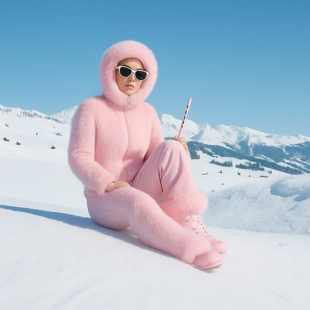 This image shows a vibrant ski resort with pastel colors, evoking a blend of high fashion and youthful aesthetics. The scene captures a unique, stylish winter landscape.