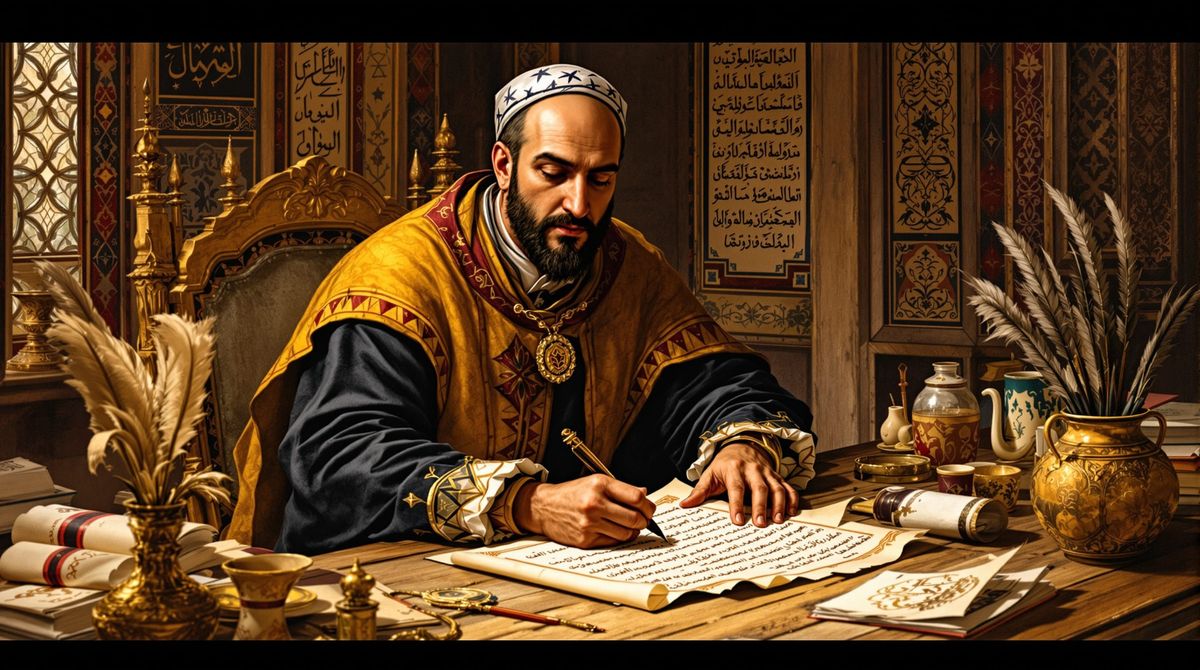 This image depicts Al-Razi, a historical physician, diligently writing his medical text. The artwork features intricate details and warm colors, mimicking medieval illuminated manuscripts.