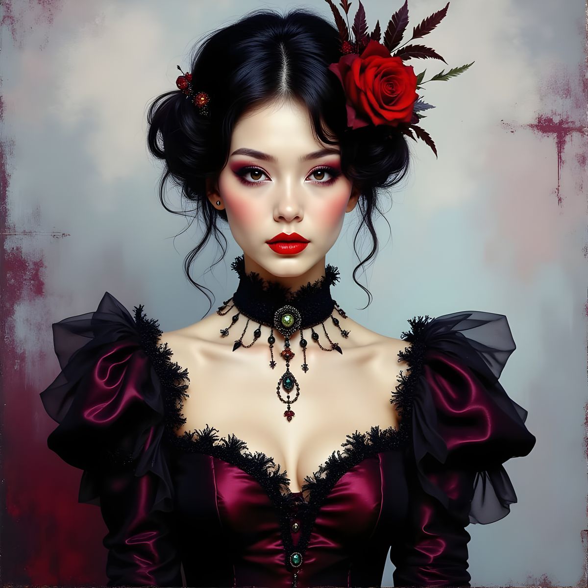 This image shows a scene rendered in a romantic and ominous style. The piece evokes film noir, with complex and detailed elements reminiscent of oil on canvas paintings.