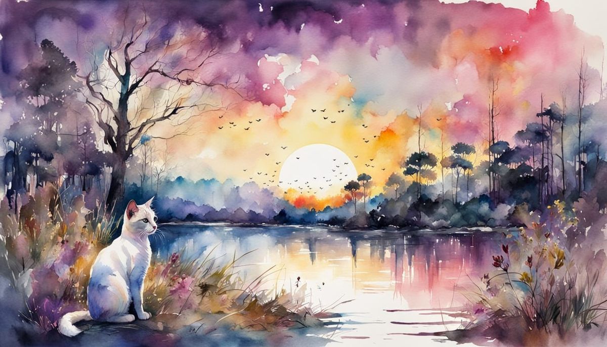 A watercolor landscape featuring a Siamese cat in the foreground. The scene includes a golden sunset, trees, and a mirrored lake, all rendered with bold brushstrokes and vibrant colors in an expressionistic style.