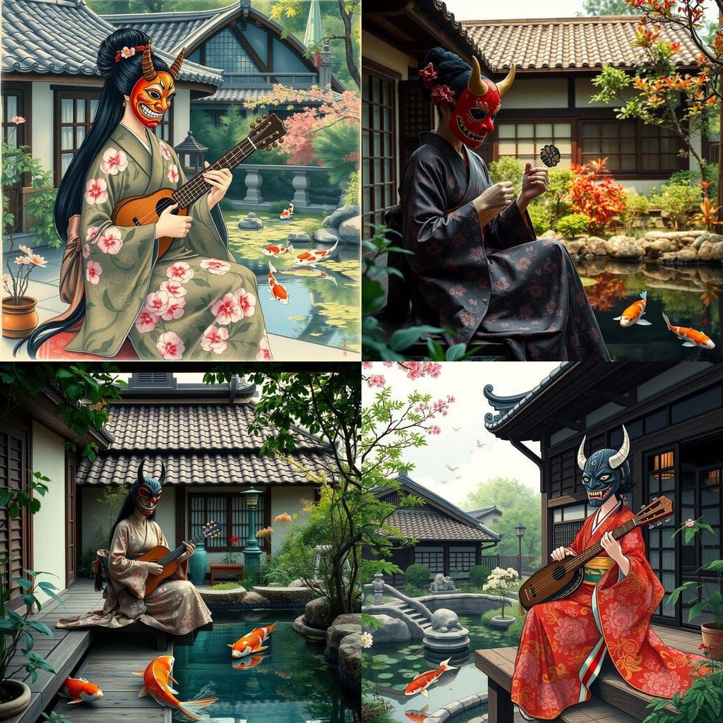 This serene image captures a Japanese woman playing a sangen on the back porch of an old Tokyo house, surrounded by a tranquil koi pond and the beauty of traditional Japanese culture.