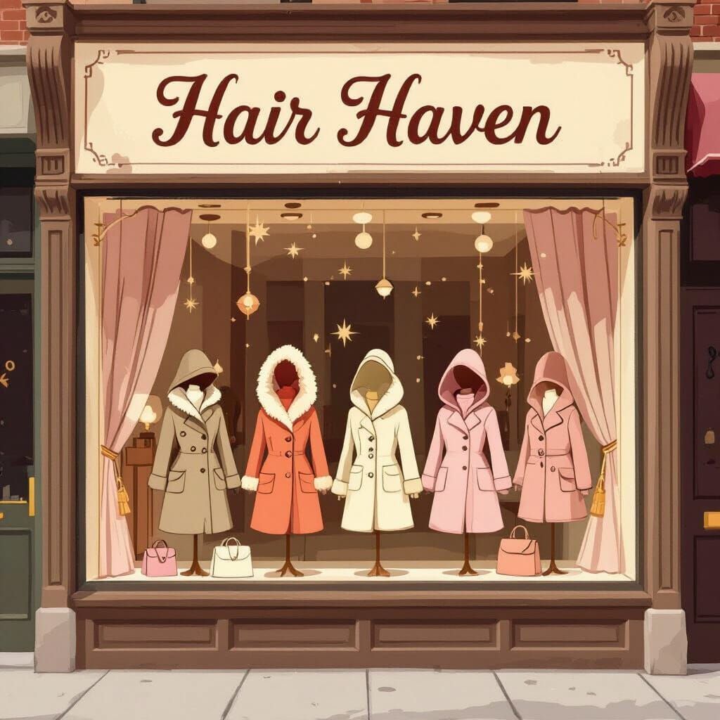 This image shows a charming New York City storefront for 'Hair Haven', featuring coats with silk-lined hoods. Rendered in a whimsical cartoon style with warm browns, creams, and pinks.