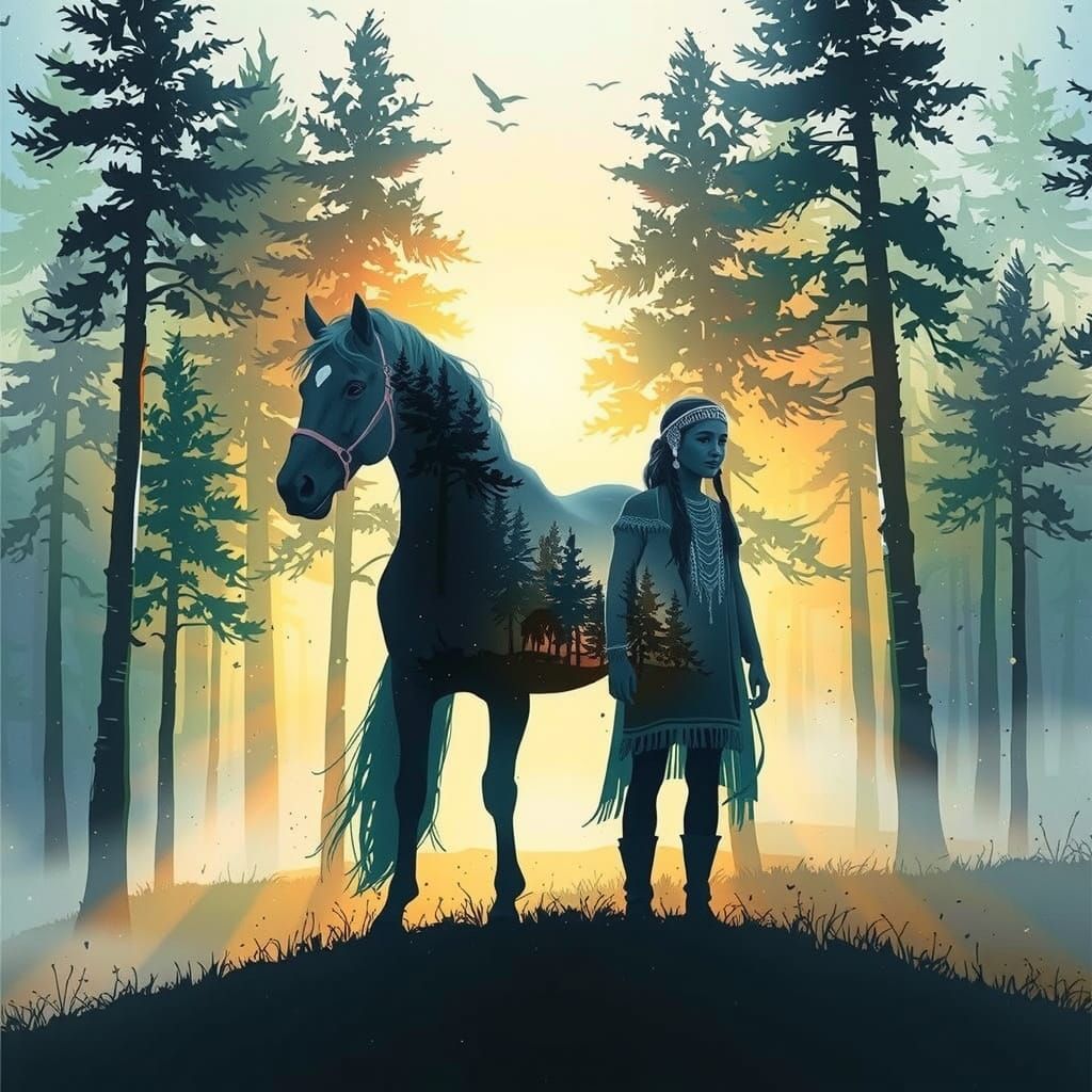 A serene watercolor illustration featuring the silhouettes of a horse and an Indian girl. A mystical forest landscape at dawn fills the double exposure, with glowing mist and golden light filtering through pine trees. Impressionistic brushstrokes evoke a dreamlike atmosphere.