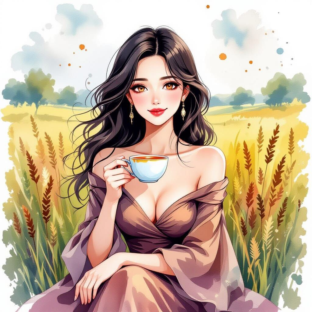 This image shows a black-haired woman with copper eyes, dressed in a silky bell-sleeved dress, enjoying tea in a field with a gentle smile, rendered in a watercolor ink splatter style.