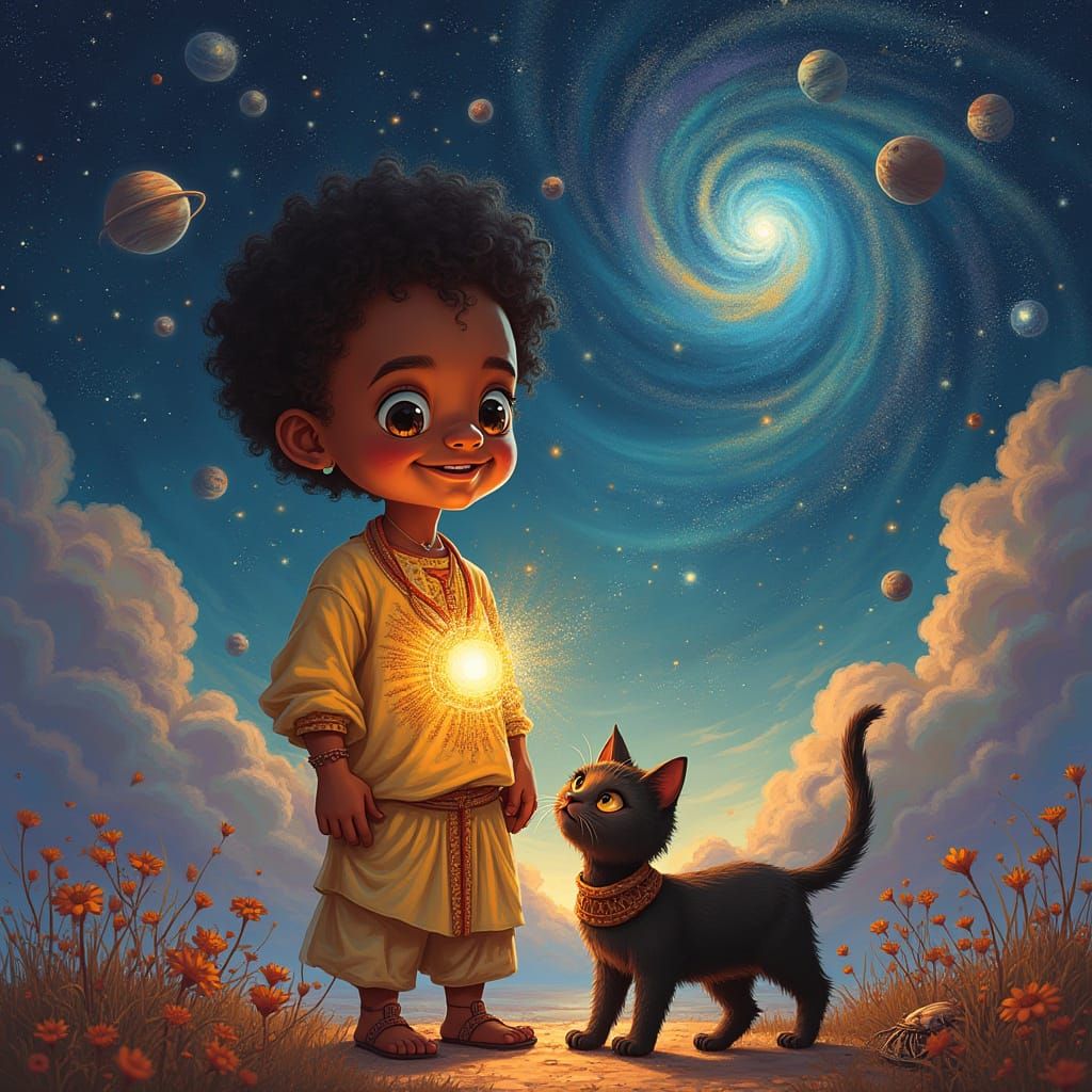 This enchanting image features a young Ethiopian boy surrounded by vibrant, dreamlike patterns and shapes, with a subtle, shimmering light emanating from his chest, as he embarks on a cosmic adventure with his loyal cat by his side, set against a backdrop of swirling stars and galaxies.