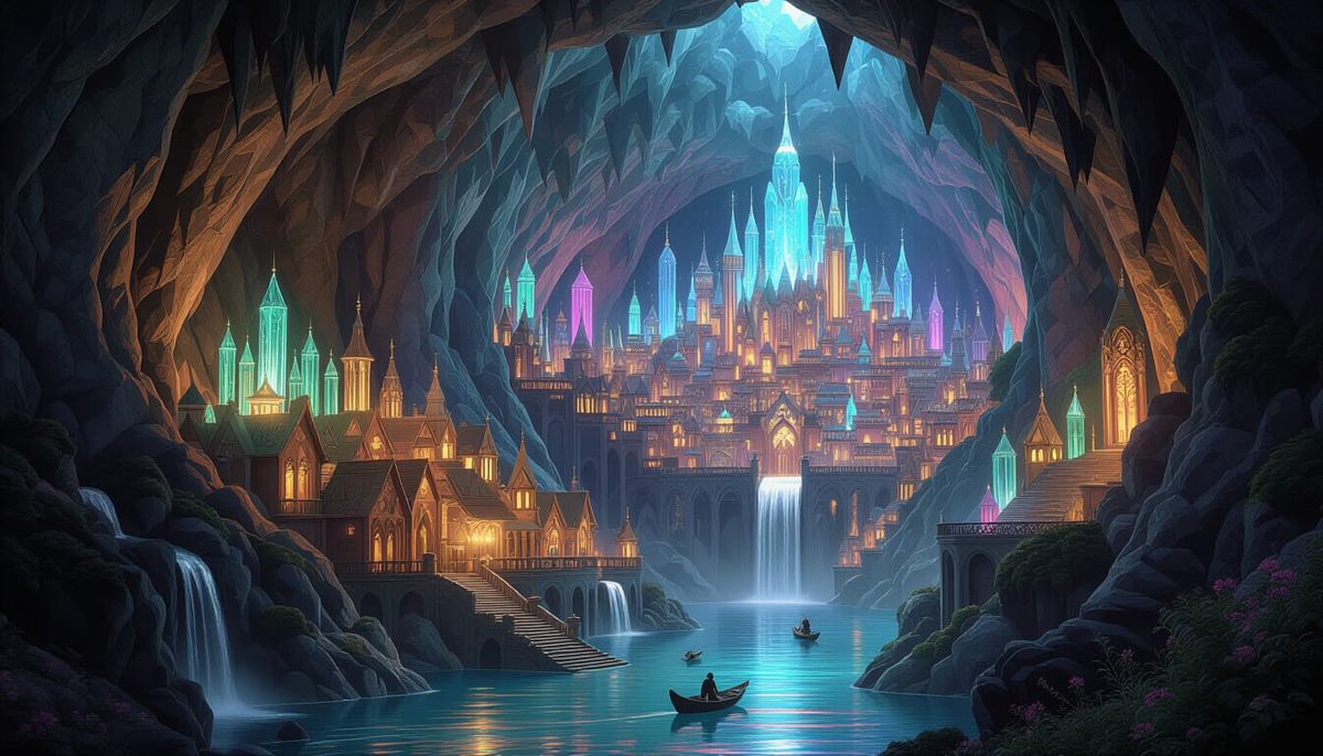 This image showcases a massive, detailed underground city within a giant cave, illuminated by colorful fairy lights. Crystal Gothic elven dwellings create an ethereal, enchanted forest atmosphere.