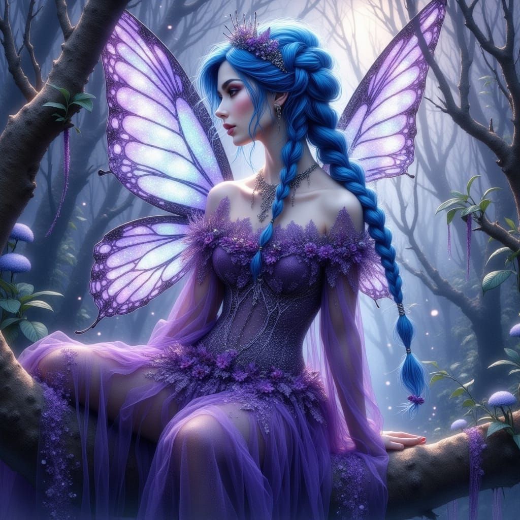 A magical fairy with blue braided hair and large butterfly wings sits on a tree branch. She wears a flowing purple gown with lace details and sparkles, in a whimsical style.