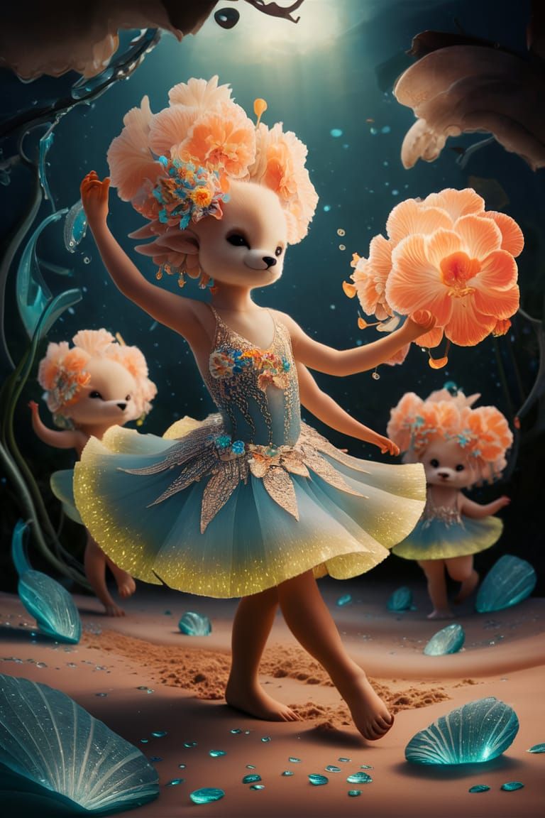 An enchanting scene of hybrid anthropomorphic bearorchids adorned in exquisite sea glass couture, designed by the talented costumier "Sea Glass Couture." The dreamer, mesmerized by the mesmerizing grace of these sea creatures, is captivated by their glowing patterns and the artist's "Sunrise Glow Mesh ...