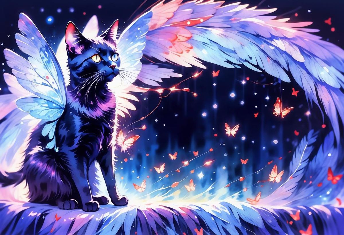 An watercolor art masterpiece of an adult vanta black cat with angel wings standing on its back legs pawing playfully at a glowing RED butterfly, with BLUE lights behind it. The cat's fur and wings shimmer with delicate strands of energy, glowing Brightly against the backdrop of a VAST rainbow in non-traditional ...