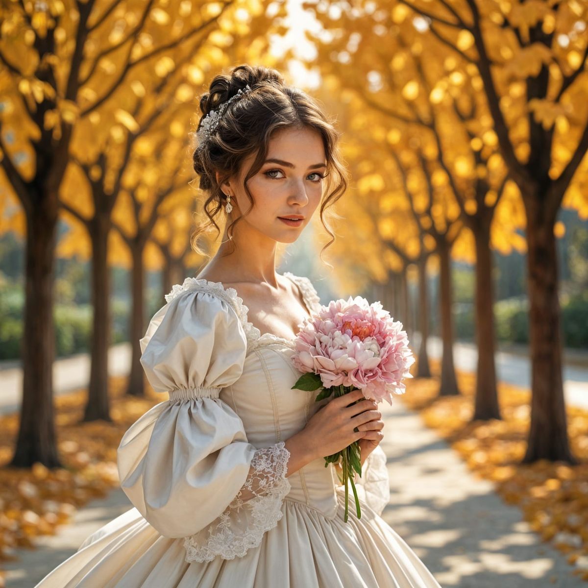 This image depicts a woman in an 18th-century style portrait, holding a pink peony with glowing golden trees behind her. The art features dramatic lighting and an inner radiance.