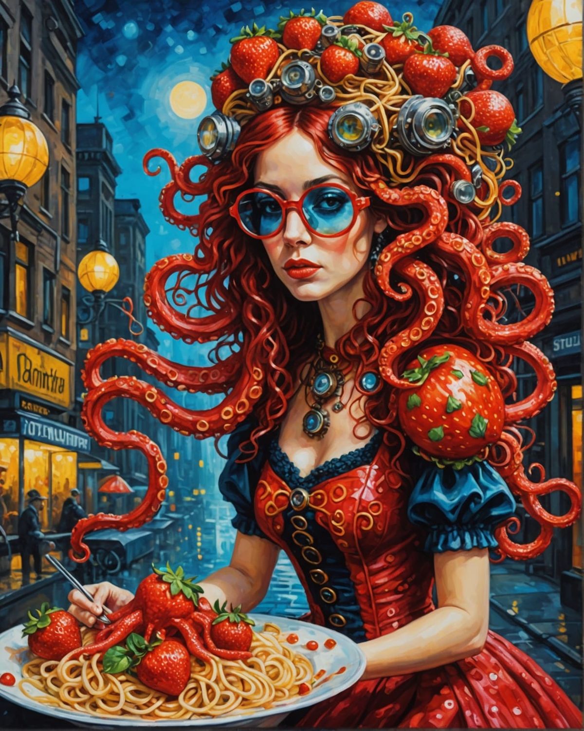 A vivid image of an octopus in a red dress enjoying spaghetti, rendered in an intricate steampunk style with bold brushstrokes and vibrant colors, set against a backdrop of a lively night city.