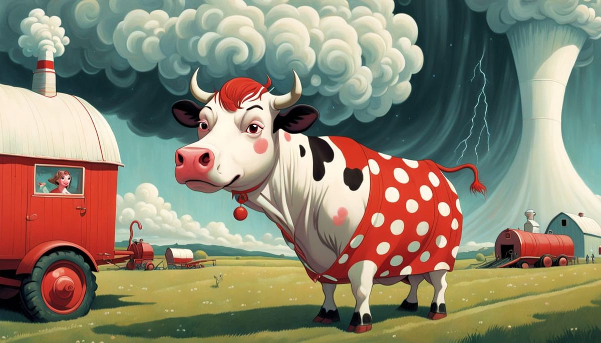 This image shows a comedy cow in a vibrant red and white polka dot dress, set against a chaotic farm tornado backdrop with a futuristic reactor and wagon in the distance, blending elements of cyberpunk and pop surrealism