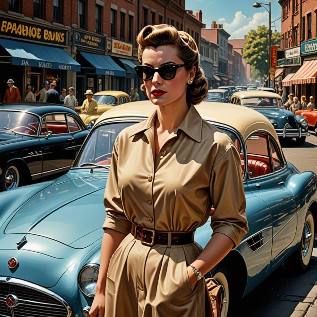 A hyperrealistic vintage advertisement featuring a beautiful lady in sunglasses posing with a sports car. The image boasts intricate details, high contrast, and a cinematic atmosphere, capturing the 1950s aesthetic.