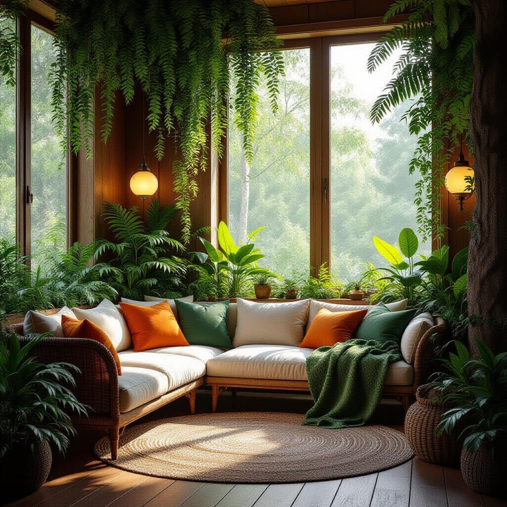 This image shows a living room transformed into a vibrant indoor forest. The 3D rendering features lush greenery and soft, warm lighting, creating a serene and immersive natural environment.