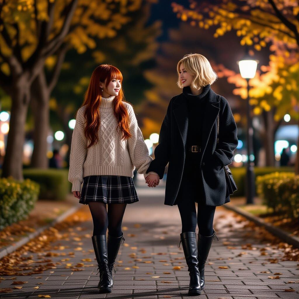 Two women share a tender moment walking hand-in-hand in a Tokyo park on an autumn night. The scene features soft bokeh and cinematic lighting, evoking a dramatic and atmospheric feel.