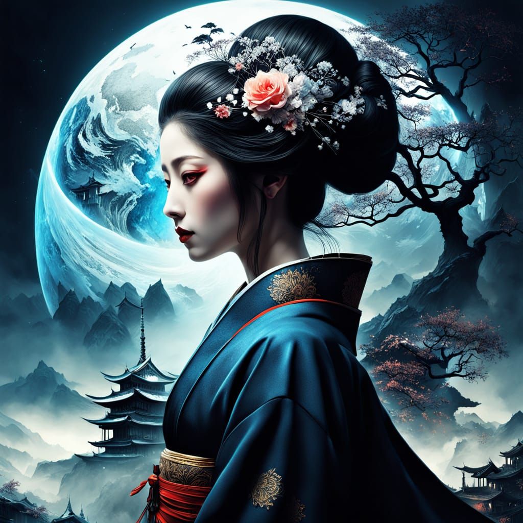 This image shows a geisha merging with a Yin Yang symbol, contrasting an exploding Earth with an icy landscape. Features a double exposure effect with vivid colors.