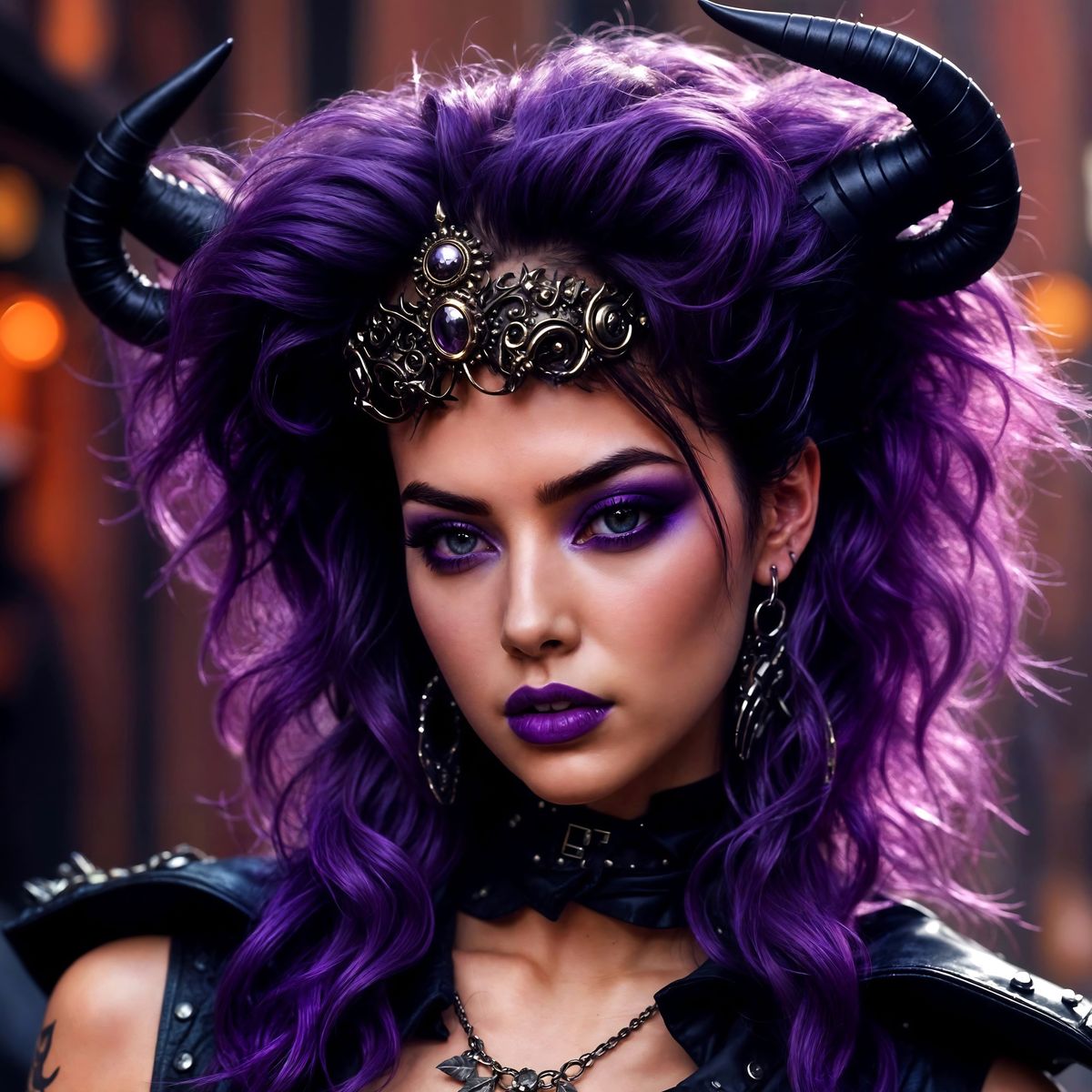 This image shows a hyperrealistic portrait of a dangerous woman called Suzy. She has a mohawk haircut, purple makeup, and knee-high leather boots, rendered in incredible detail.