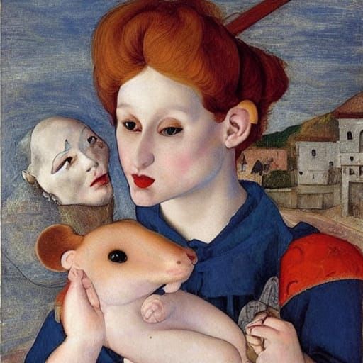 A whimsical image depicts a mouse and a vampire celebrating a fictional holiday. The artwork blends styles reminiscent of Renaissance and Expressionist painters.