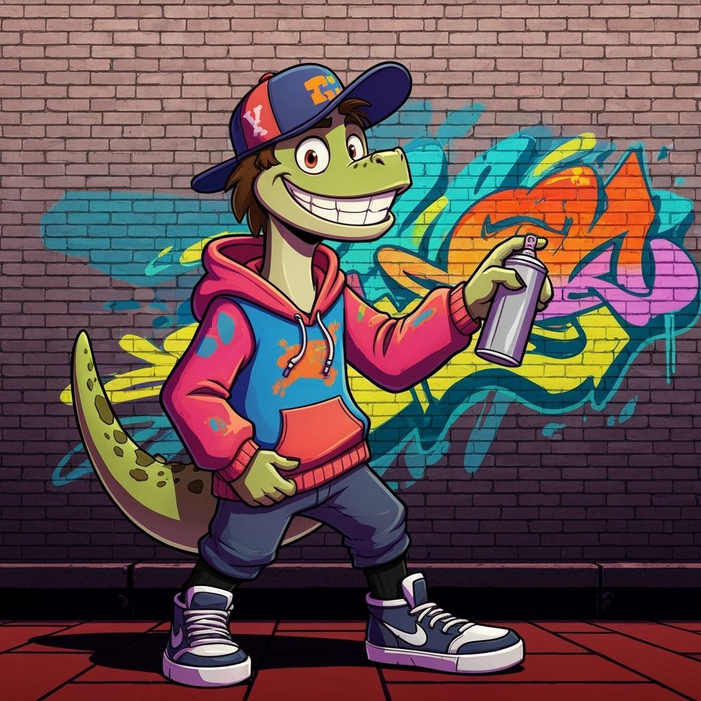 This image shows a cheerful teenage dinosaur sporting a hoodie, sneakers, and cap, creating graffiti art. The artwork is rendered in a vibrant, high-contrast 2D cartoon style, with dynamic shapes and polychromatic colors.