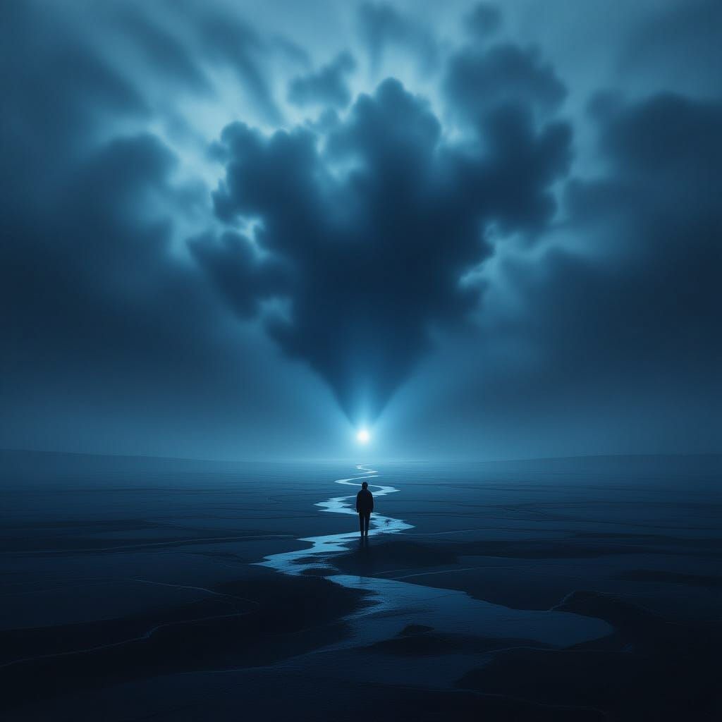 This striking National Geographic style photo captures the oppressive darkness of depression. A desaturated, melancholic landscape is swallowed by shadows, with a subtle glow emphasizing isolation. High contrast lighting creates an intense atmosphere.