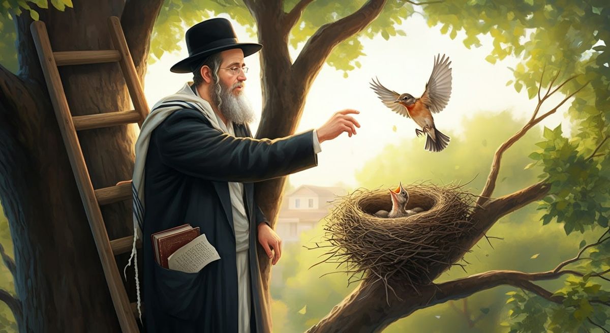 This image depicts a Hasidic Jewish man performing Shiluach HaKen. The man, in traditional attire, balances on a ladder, gently encouraging a mother bird to fly from her nest in this comic art style illustration.