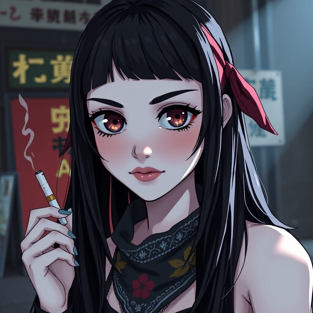 This image shows a crazed-looking Caucasian woman with long black hair, a punk bandana, and a cigarette. The image is cel-shaded with deep colors, reminiscent of anime and manga art.